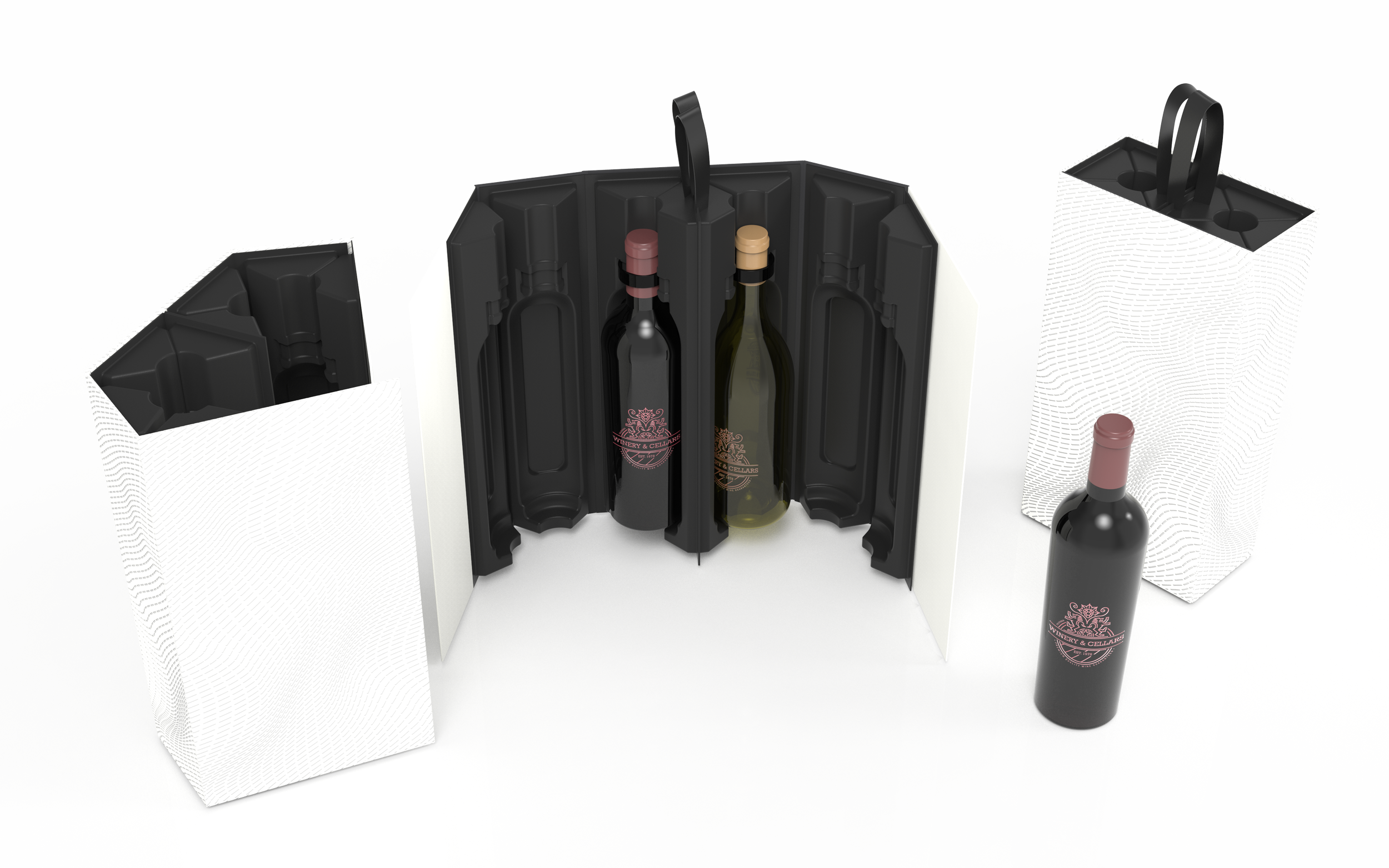 Precision molded pulp bottle cradles uniquely configured to fit all known 750 ML styles of bottles; Cabernet, Burgundy, Chardonnay, Champagne.